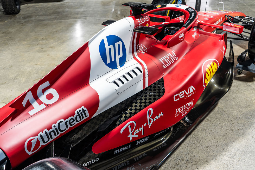 The SF-25 was campaigned by Scuderia Ferrari during the 2025 Formula 1 season by drivers Lewis Hamilton and Charles Leclerc. This 1:1 scale replica wears a red and white Scuderia Ferrari Formula One Team livery with sponsor logos including HP, Shell, Puma, Peroni, IBM, and Richard Mille. Additional details include multi-plane front and rear wings, side pods, side mirrors, a cockpit halo, a faux air intake, a rear diffuser, and a replica rain light.