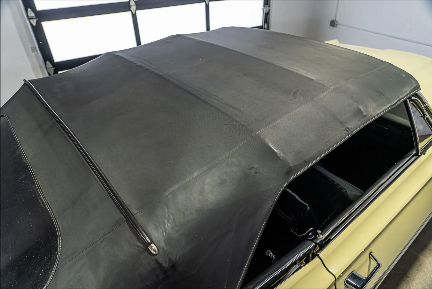 The car left the factory finished in Yellow (8) and features a black soft top and boot. Details include a segmented grille, quadruple headlights, side moldings, and vertical polygonal taillights. The seller notes a tear in the soft top, which is shown up close in the image gallery below along with clouding in the rear window and dings on the right-front corner.
