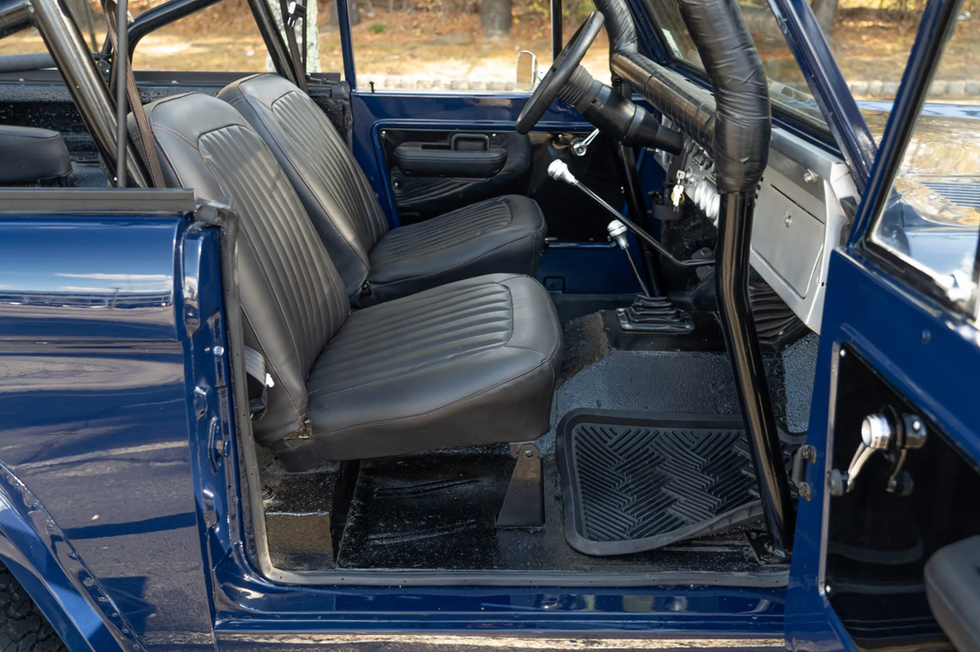 The front bucket seats and rear bench were re-trimmed in black upholstery under current ownership, and bedliner material was applied to the floors. A padded family-style roll cage protects the cab, and additional equipment includes a tilt steering wheel, a heater, and a glove compartment.