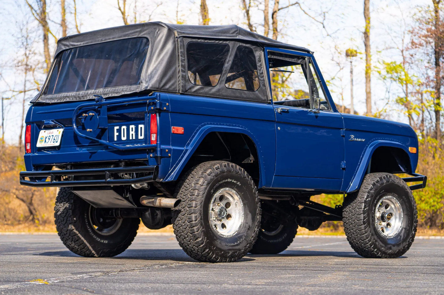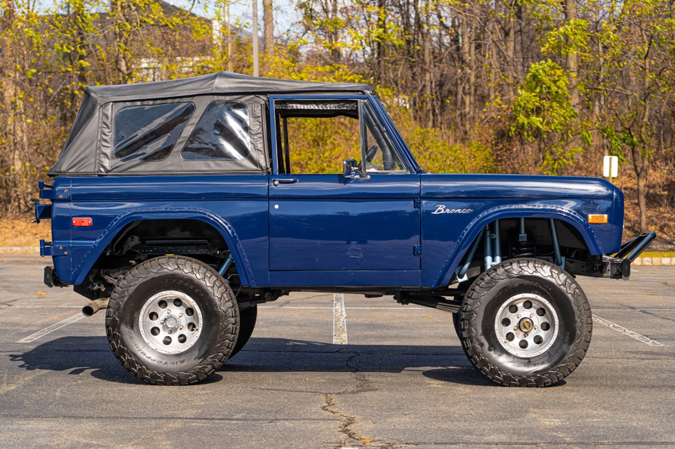 This 1973 Ford Bronco is finished in blue and powered by a 302ci V8 that is fitted with a Holley carburetor, an Edelbrock intake manifold, and MSD ignition. Power is routed through a four-speed manual transmission and a dual-range transfer case, and the truck rides on body and suspension lifts and 15″ Pro Comp alloy wheels with 35″ BFGoodrich tires. Additional equipment includes a black soft top and a tubular front bumper with a bull bar along with a family-style roll cage, manually locking front hubs, power front disc brakes, a tilting Grant steering wheel, and front bucket seats trimmed in black upholstery. The truck was acquired by the current owner in 2017. This Bronco is now offered by the seller on behalf of the current owner in New Jersey with a Standard Marti report and a clean Utah title in the current owner’s name.