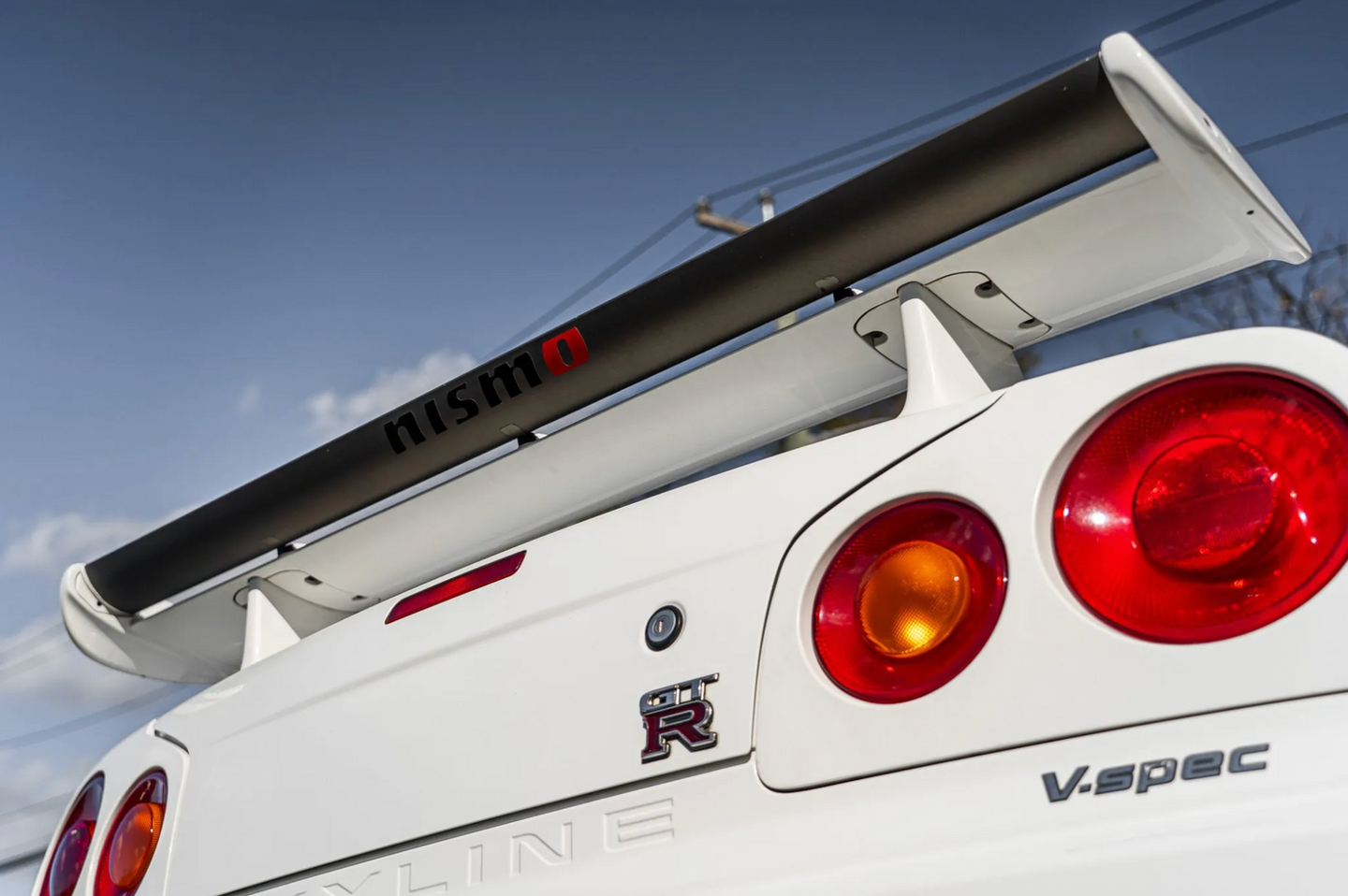 Approximately 4,194 Series 1 V-Spec units were produced, and this example left the factory finished in white (QM1). Exterior details include xenon headlights, a front splitter, clear side marker lamps, power-folding side mirrors, a rear window wiper, an adjustable rear wing with a Nismo-branded flap, a rear fog lamp, and a carbon-fiber rear diffuser.