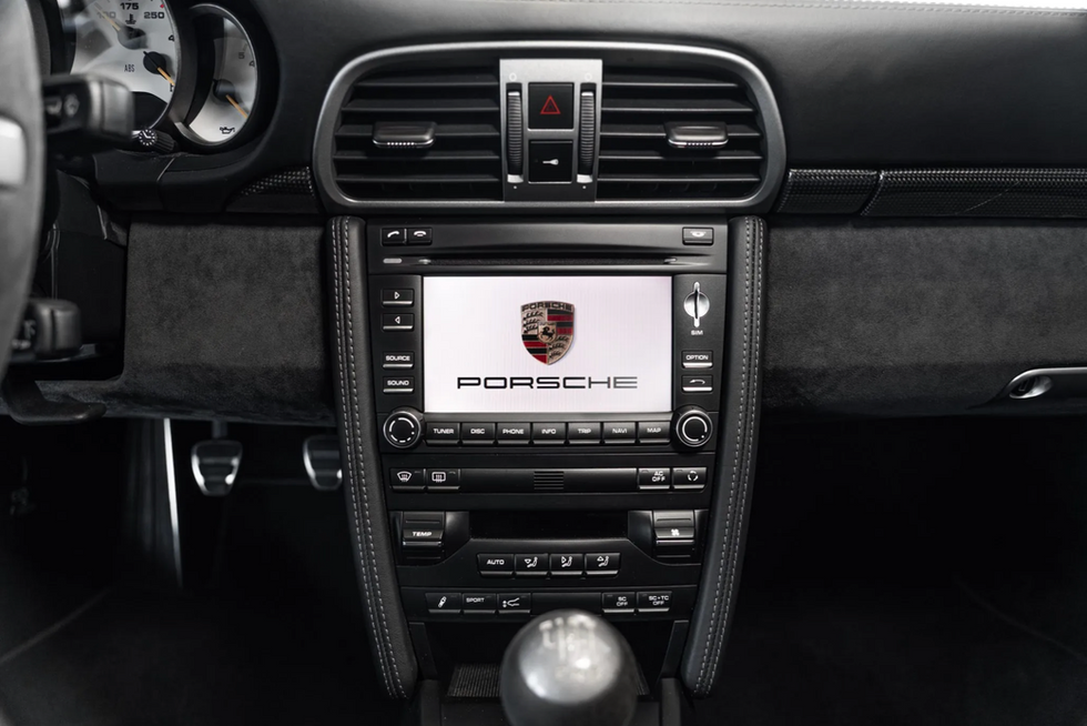 The carbon-fiber-backed sport seats are upholstered in black leather along with Alcantara, which extends to the steering wheel, shifter, dash, headliner, and door panels. The seats are accompanied by Guards Red seatbelts, and the dash, center console, and door sills wear carbon-fiber trim. Further equipment includes the Sound Package Plus, PCM 3.0 with extended navigation, automatic climate control, and cruise control.