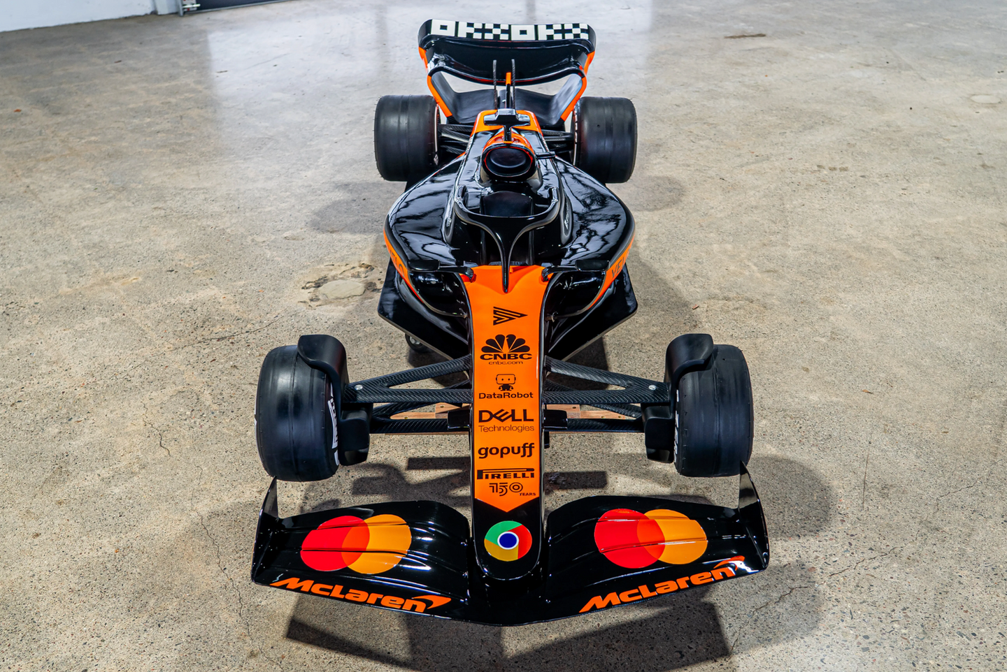 The fiberglass bodywork was built to resemble the modern McLaren cars. It is finished in black and orange livery with white accents and sponsor logos that include Alteryx, Chrome, CNBC, Mastercard, Richard Mille, and Velo. Additional details include a front wing, sculpted side pods, a dual-plane rear wing, and a cockpit halo. A multifunction steering wheel is stationed in the cockpit.