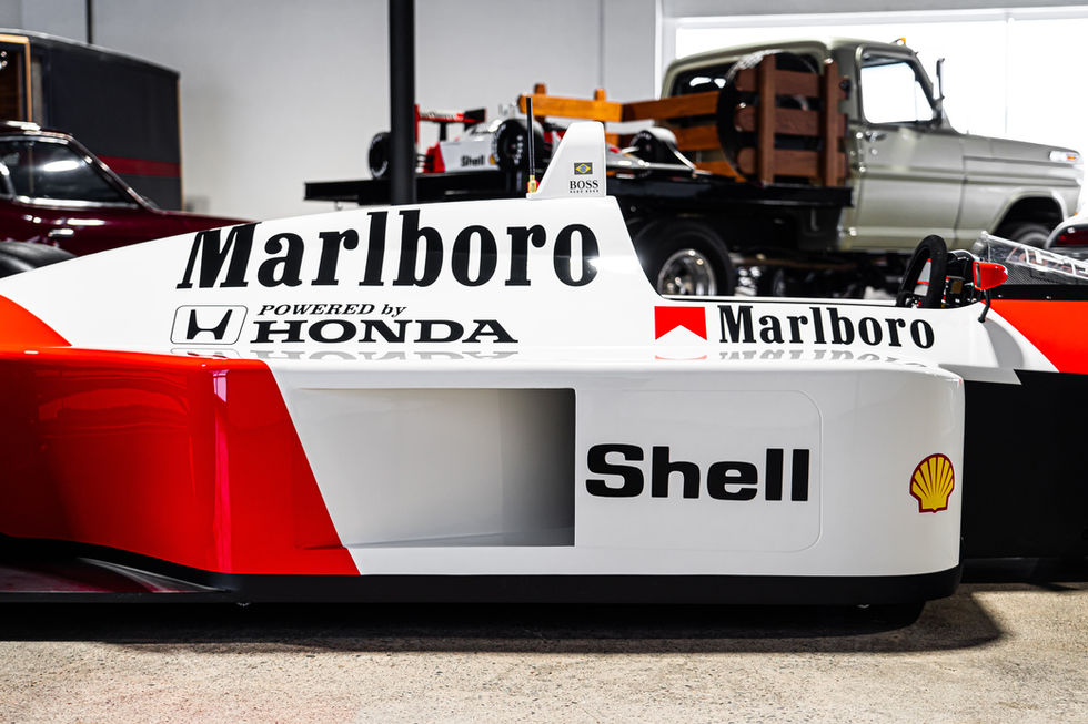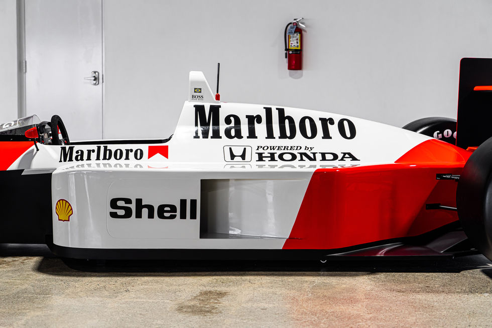 The Steve Nichols-designed McLaren MP4/4 debuted at the 1988 Brazilian Grand Prix and secured wins and pole positions in 15 out of 16 races at the hands of drivers Ayrton Senna and Alain Prost. This 1:1 scale replica of the #12 car was constructed using fiberglass and carbon-fiber, and it wears a white and red McLaren Formula One Team livery with sponsor logos including Marlboro, Shell, Honda, and Tag Heuer. Additional details consist of front and rear wings, side pods, red-finished side mirrors, an external kill switch, a roll hoop, a rear diffuser, and a replica rain light.
