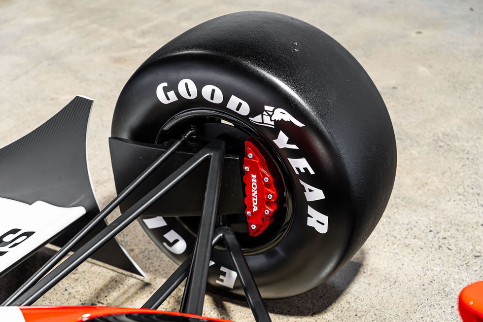 The wheels and tires are constructed with fiberglass, and the latter showcase white Goodyear Eagle lettering. The simulated braking system includes cooling ducts, carbon ceramic rotors, and Honda-branded red calipers, while the replica suspension is comprised of carbon-fiber double-wishbones with push- and pull-rods. A faux auxiliary oil cooler is situated out back.